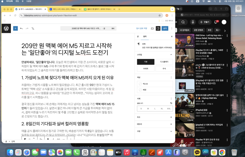 안녕하세요, ‘일단좋아’입니다. 오늘은 제 인생에서 가장 큰 소비이자, 새로운 삶의 시작점이 될 맥북 에어 M5 구매 후기와 함께 제가 왜 갑자기 워드프레스 블로그를 시작하게 되었는지 그 솔직한 이야기를 들려드리려고 합니다.